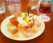 これが持って来られた時、どこから食べるか本当に迷った。というのは、下の白い皿以外は全て菓子であり、つまり食べられるからだ。皿の中にある器状のものは薄い焼き菓子で、器の周りに敷き詰められているのはふわふわしたグレープフルーツゼリーとミカン、その上にオレンジソースと粉砂糖がかけられている。器の中身を一番下から書いてくと、