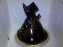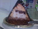 写真を見ての通り三角錐の形をしていて、表面はチョコレートでコーティングしてある。恐らくこのチョコにリキュールが混ぜてある。中身は層構造で(下写真参照)、下からチョコスポンジ・バナナクリーム・チョコスポンジの順。それらを覆い三角錐に形作っているのは、キャラメル味のムース。